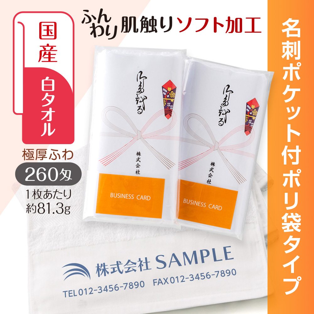 「国産白ソフトタオル 260匁(もんめ)名刺ポケット付ポリ袋 名入れ印刷」は、国産の肌触りがよいタオルです。