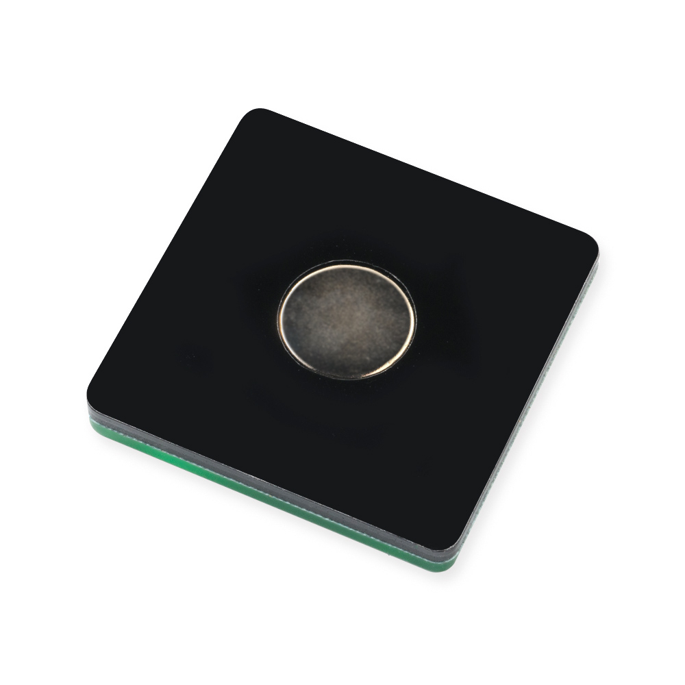 アクリルマグネットでは、黒いアクリル層に発色を高める白押さえを施し、ロゴやイラストを片面フルカラー印刷で色鮮やかにプリントしています。印刷面の上には透明のアクリル層を重ね、クリアな艶めきと耐久性をプラス。裏面には小型ながらも強力なネオジウム磁石を取り付け、磁石対応の黒板やホワイトボードなどにしっかりくっつくように仕上げました。