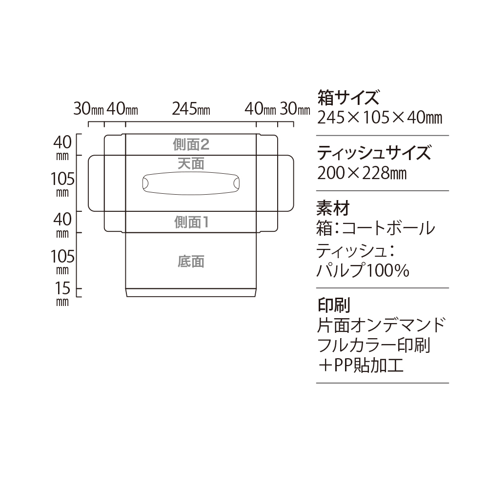 箱:245×105×40㎜、ティッシュ:200×228㎜ |