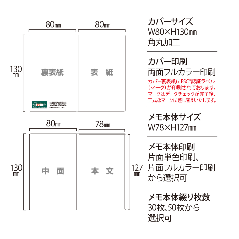 カバー:コート230㎏(FSC®認証紙)、メモ本体:上質55㎏(FSC®認証紙) |