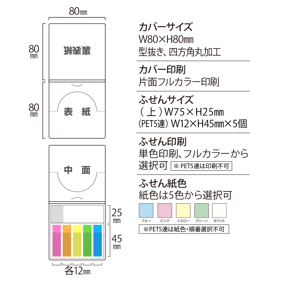カバー:ホワイトのみ、ふせん:ホワイト、グリーン、イエロー、ブルー、ピンクから選択可、PET5連は選択不可 |