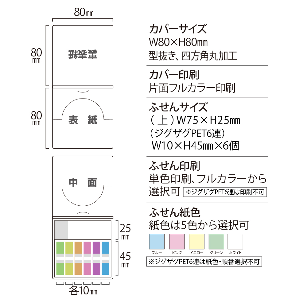 カバー:ホワイトのみ、ふせん:ホワイト、グリーン、イエロー、ブルー、ピンクから選択可、PET6連は選択不可 |