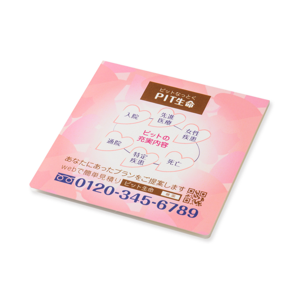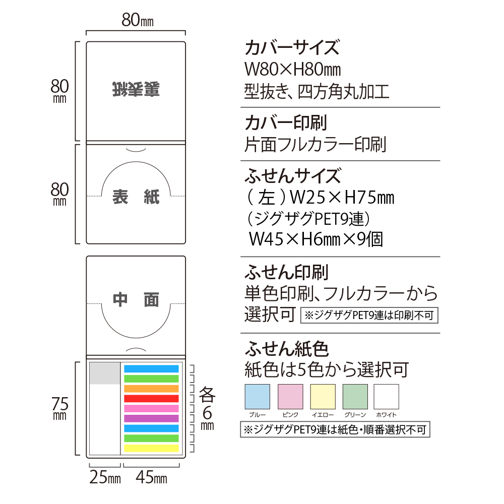 カバー:両面フルカラー印刷、ふせん:片面単色印刷or片面フルカラー印刷 ※PET9連印刷不可 |