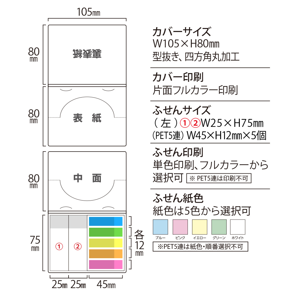 カバー:ホワイトのみ、ふせん:ホワイト、グリーン、イエロー、ブルー、ピンクから選択可、PET5連印刷不可  |