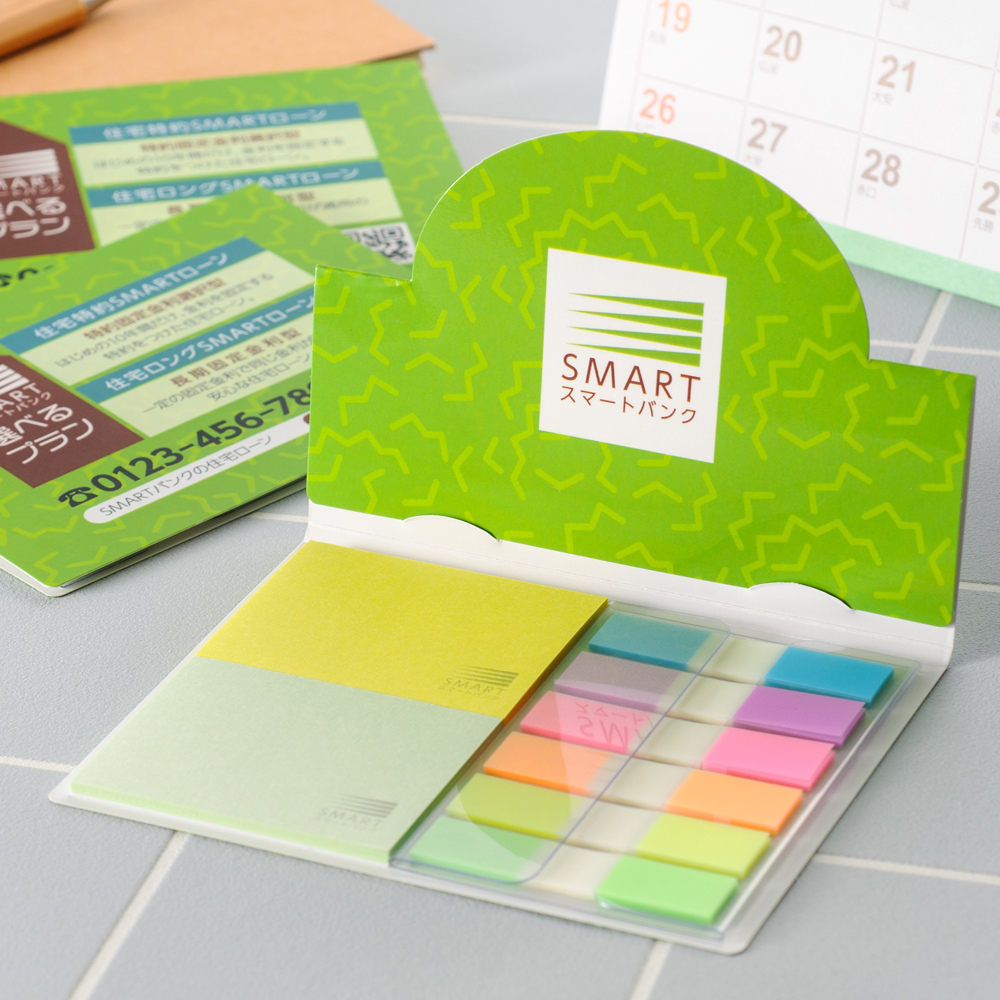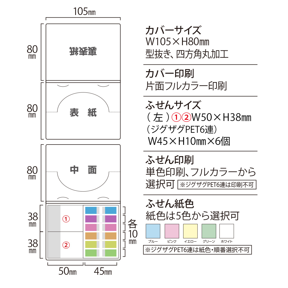 カバー:ホワイトのみ、ふせん:ホワイト、グリーン、イエロー、ブルー、ピンクから選択可、PET6連印刷不可  |