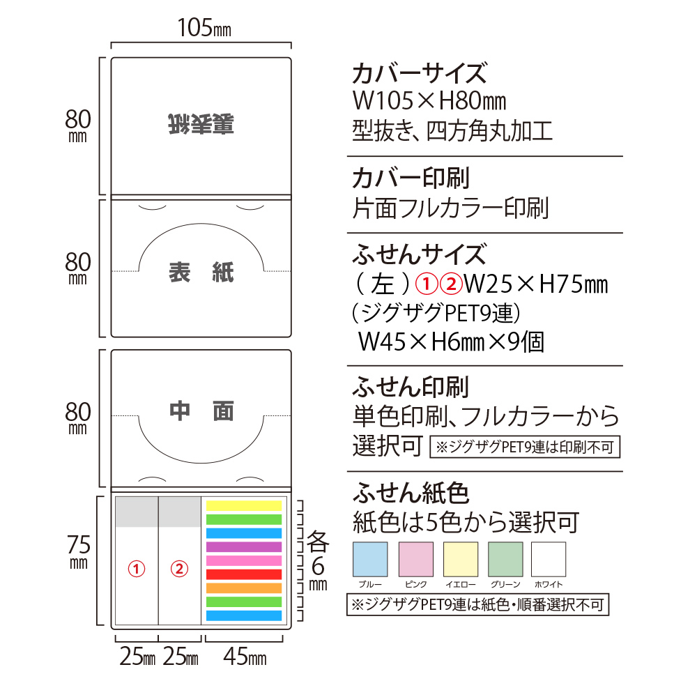 カバー:ホワイトのみ、ふせん:ホワイト、グリーン、イエロー、ブルー、ピンクから選択可、PET9連印刷不可  |