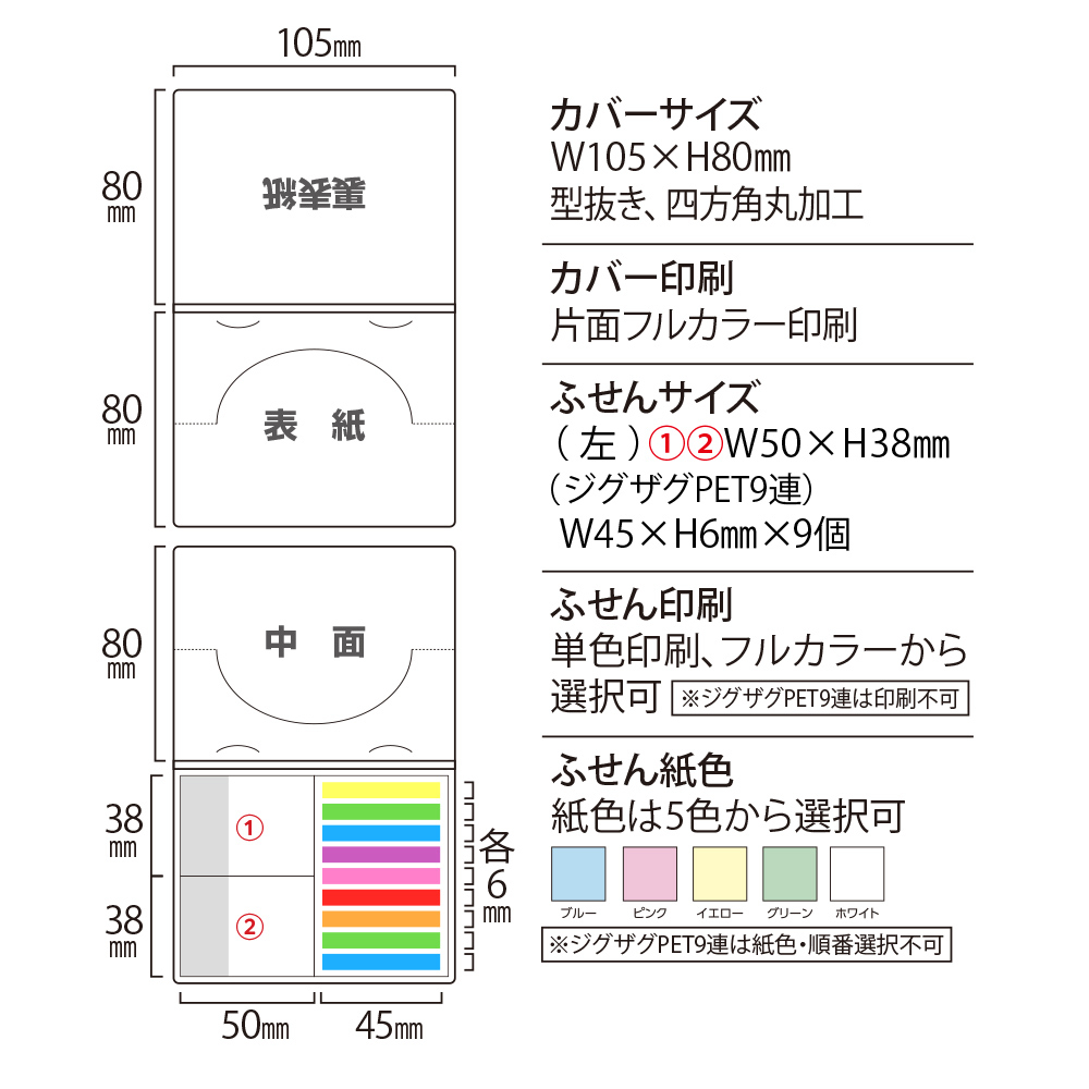 カバー:ホワイトのみ、ふせん:ホワイト、グリーン、イエロー、ブルー、ピンクから選択可、PET9連印刷不可  |