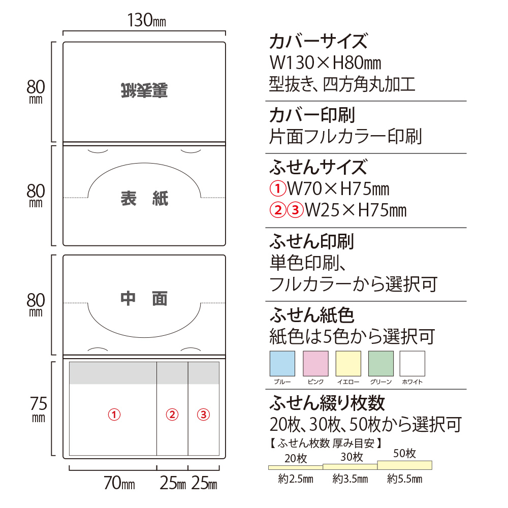 〇ふせん綴り枚数:20枚、30枚、50枚綴りから選択可 |