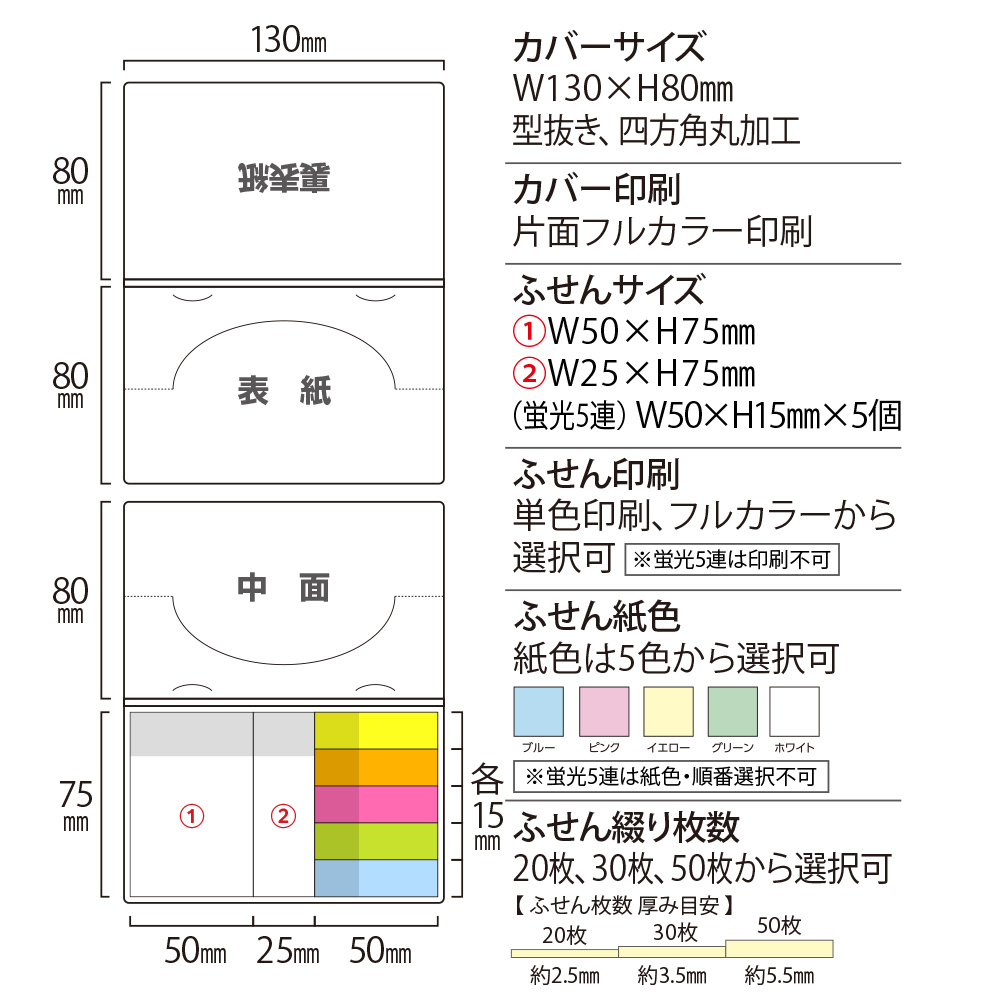カバー:ホワイトのみ、ふせん:ホワイト、グリーン、イエロー、ブルー、ピンクから選択可、蛍光5連印刷不可 |