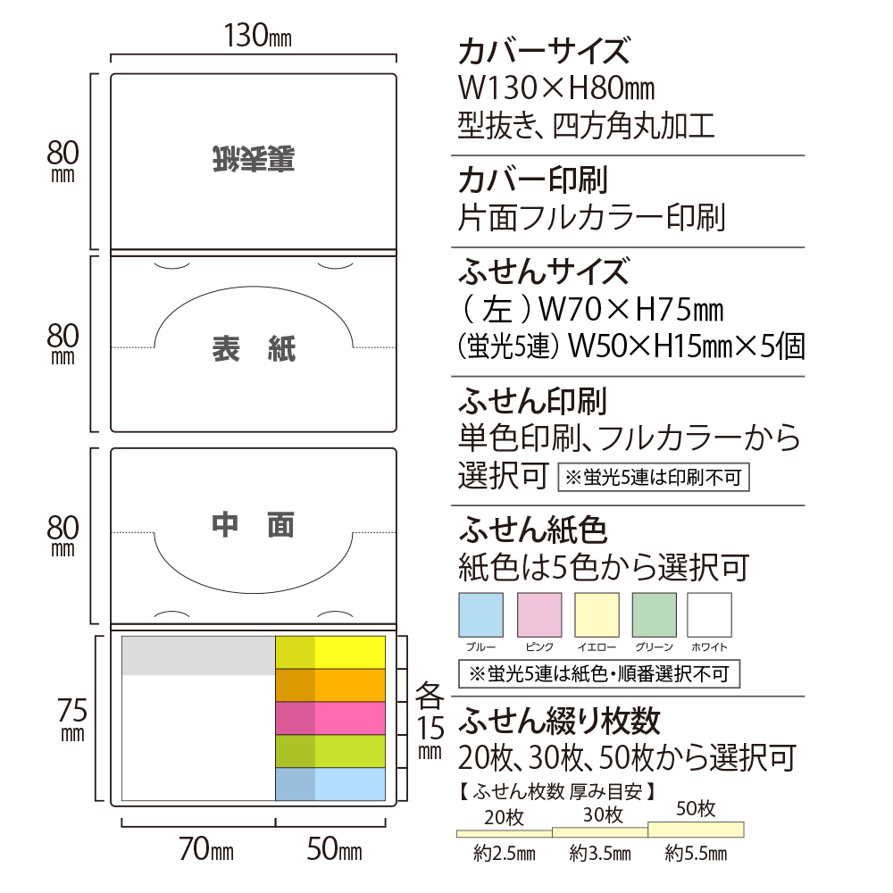カバー:ホワイトのみ、ふせん:ホワイト、グリーン、イエロー、ブルー、ピンクから選択可、蛍光5連印刷不可 |