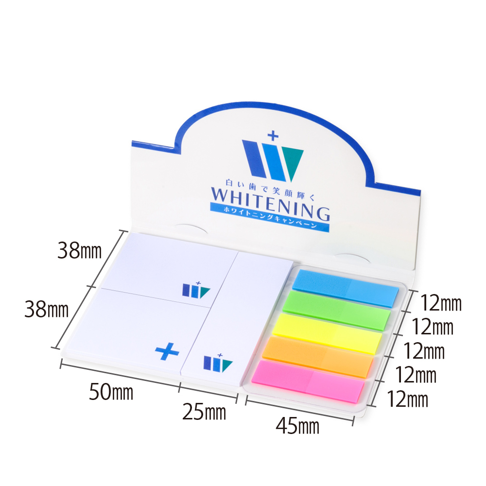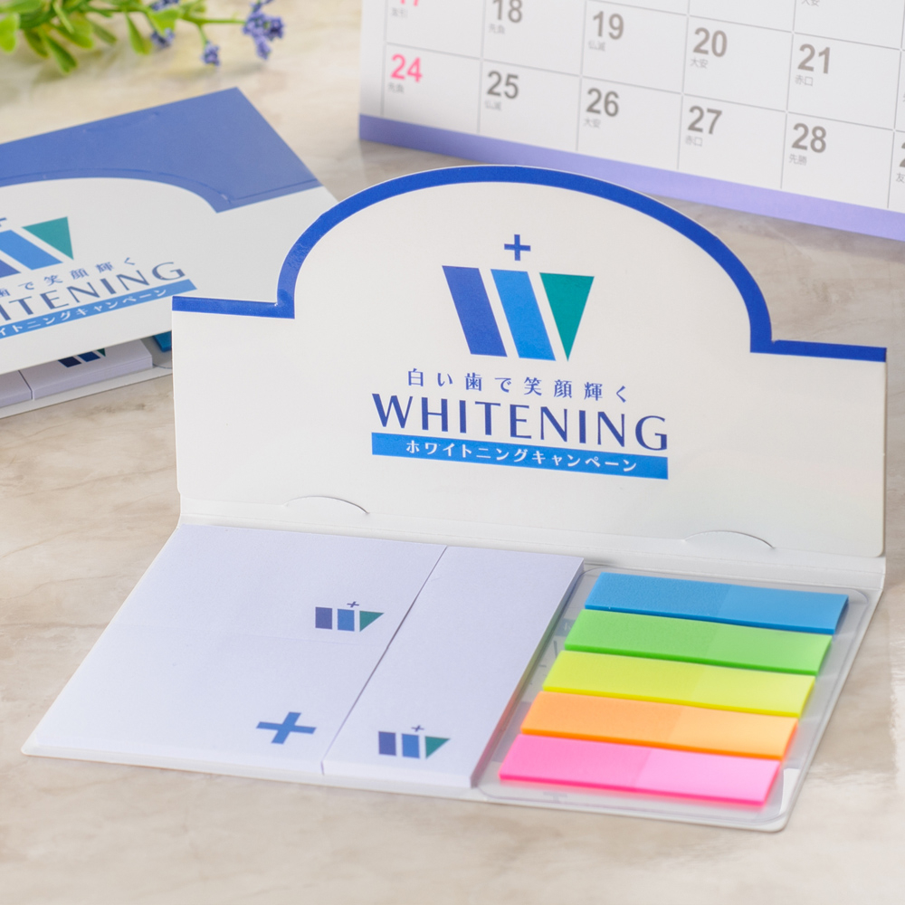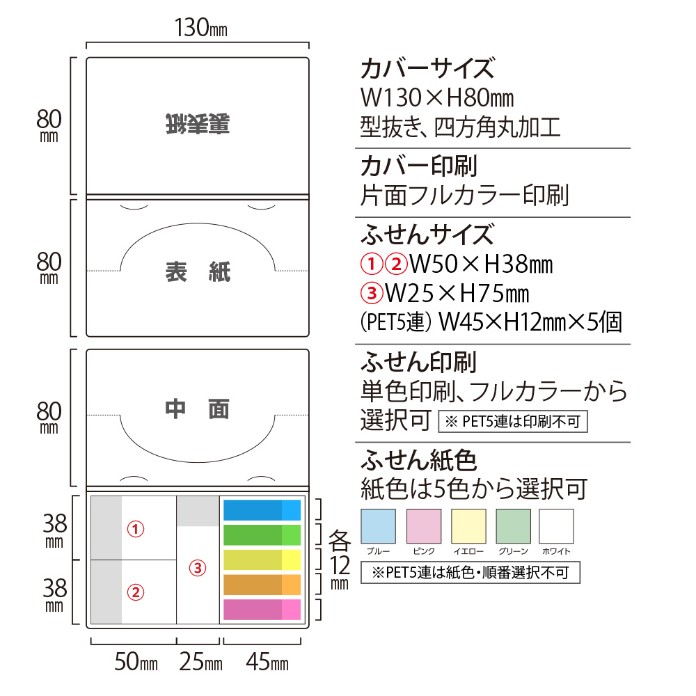カバー:ホワイトのみ、ふせん:ホワイト、グリーン、イエロー、ブルー、ピンクから選択可、PET5連印刷不可 |