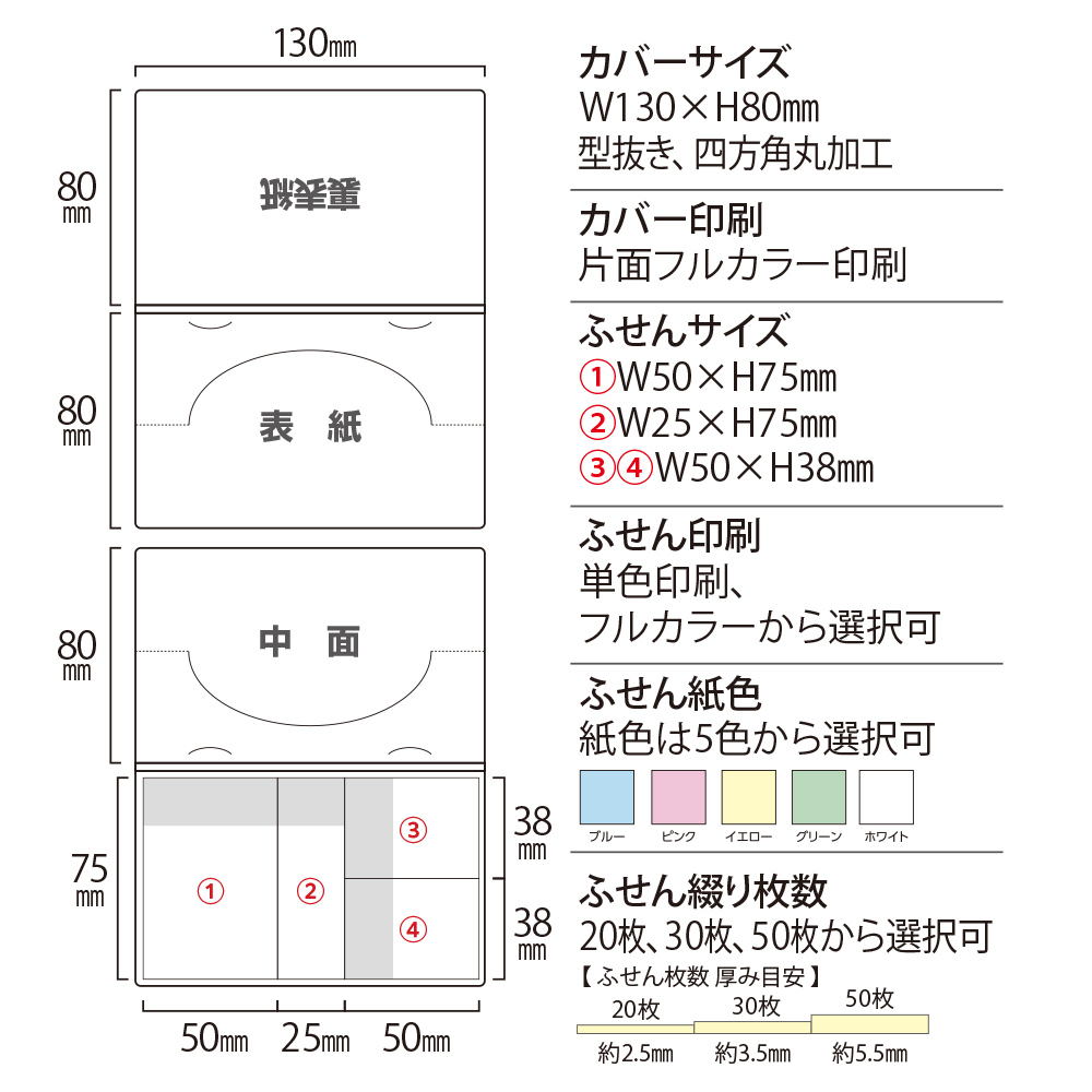 〇ふせん綴り枚数:20枚、30枚、50枚綴りから選択可 |