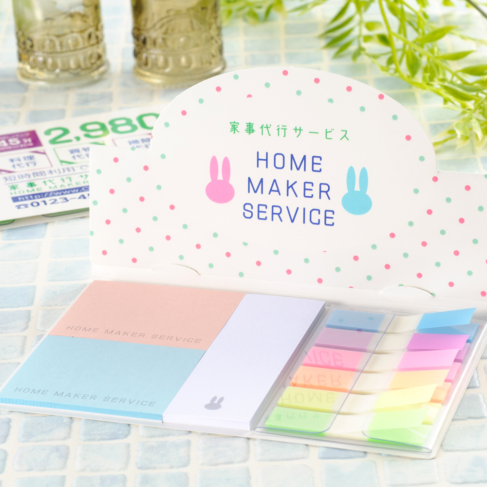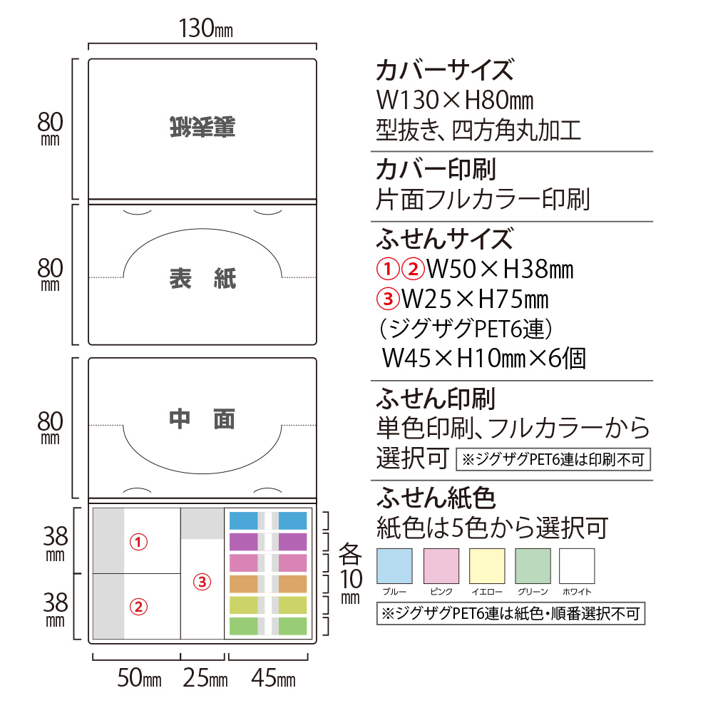 カバー:ホワイトのみ、ふせん:ホワイト、グリーン、イエロー、ブルー、ピンクから選択可、PET6連印刷不可 |