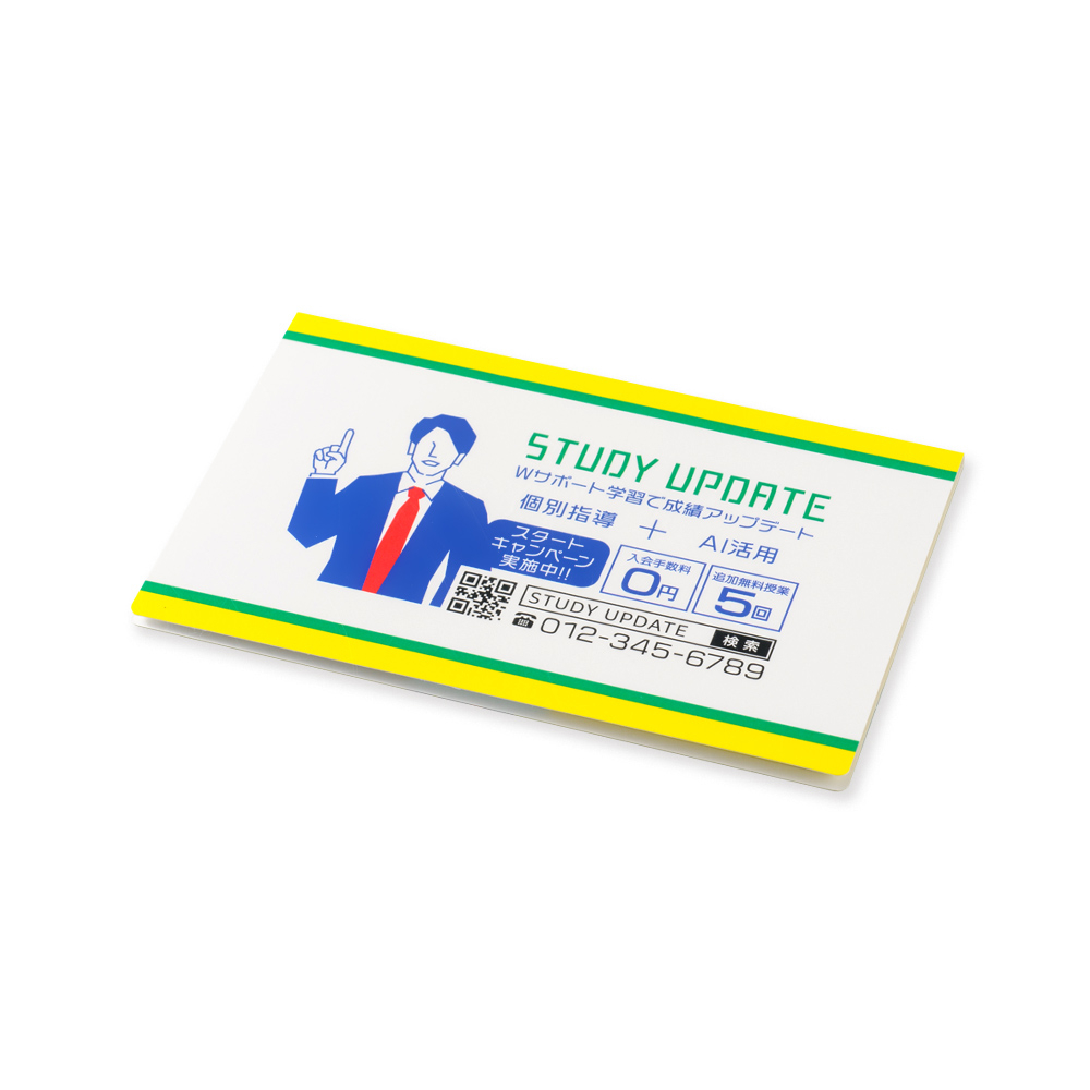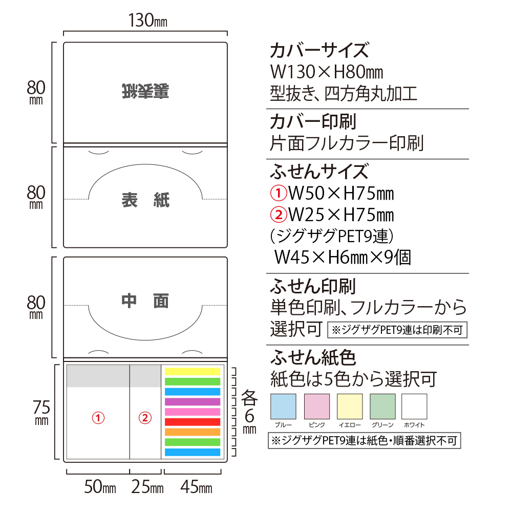 カバー:ホワイトのみ、ふせん:ホワイト、グリーン、イエロー、ブルー、ピンクから選択可、PET9連印刷不可 |