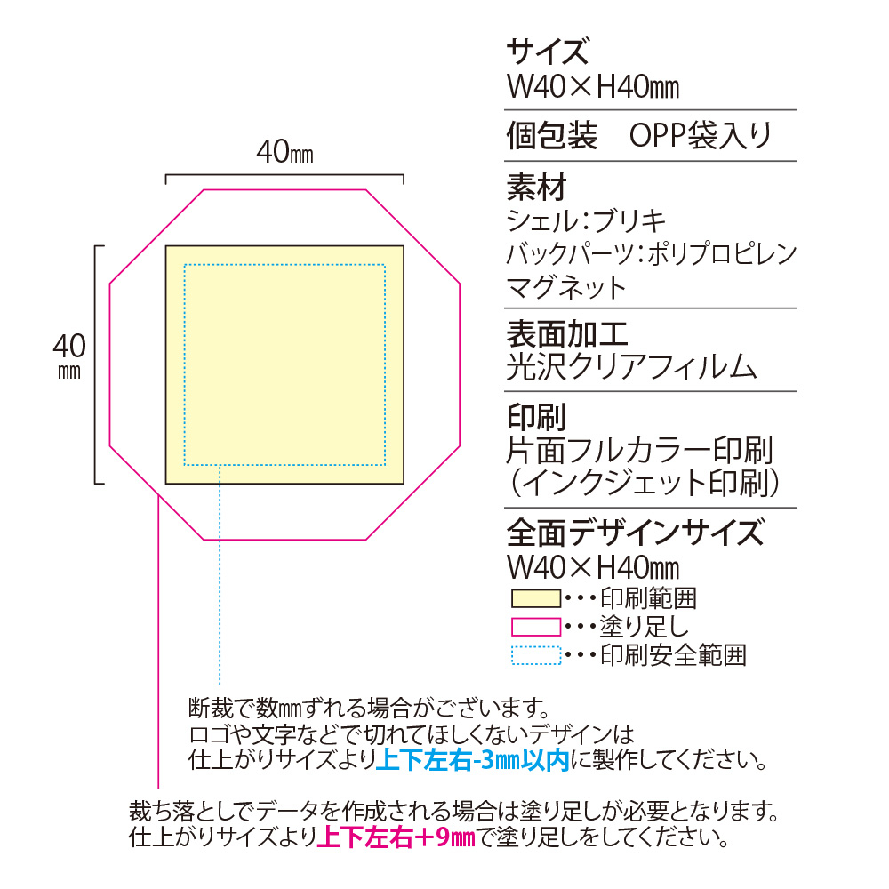 〇シェル部分:ブリキ 〇バックパーツ:ポリプロピレン 〇印刷部分:コート90㎏ 〇表面:光沢クリアフィルム 〇他:マグネット |