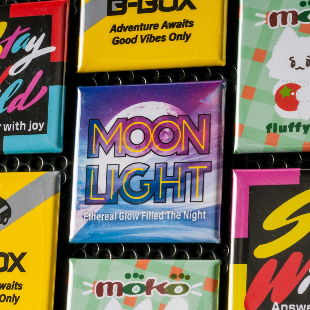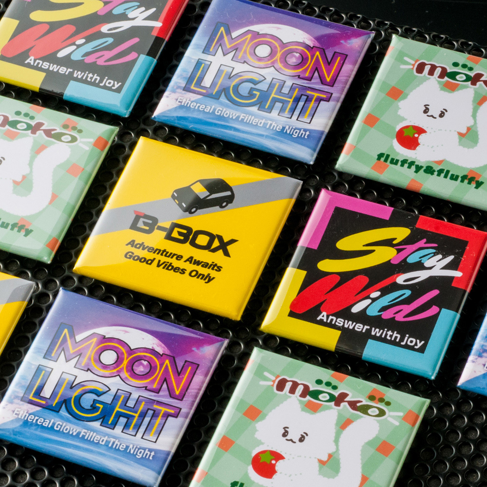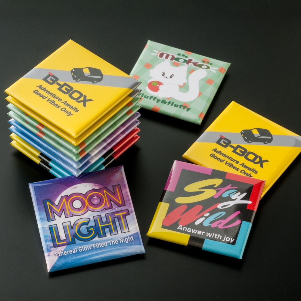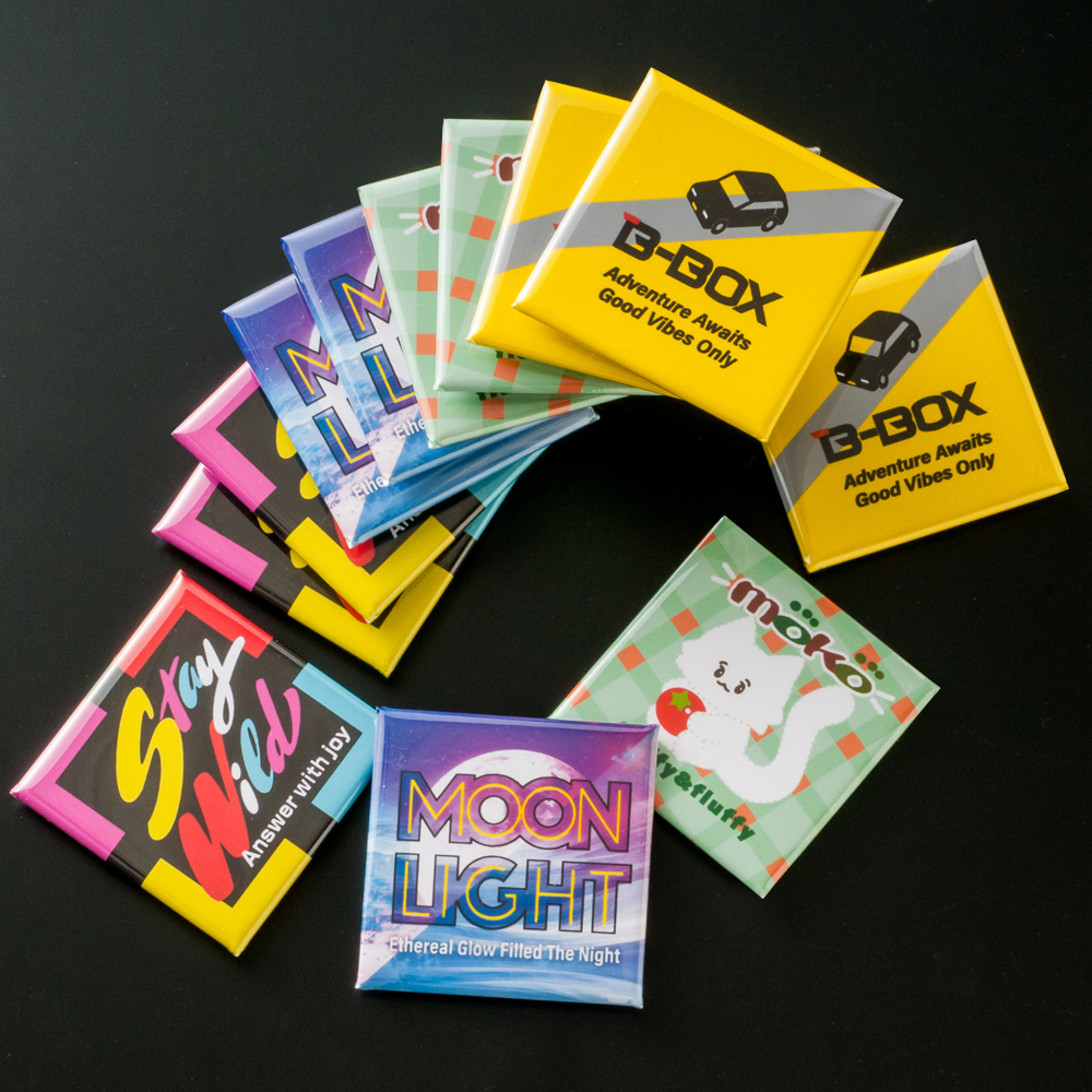 冷蔵庫やホワイトボードにも付けられる!フルカラーデザインで印象的な正方形マグネット缶バッジ。販促・記念品にぴったり(短納期対応商品)