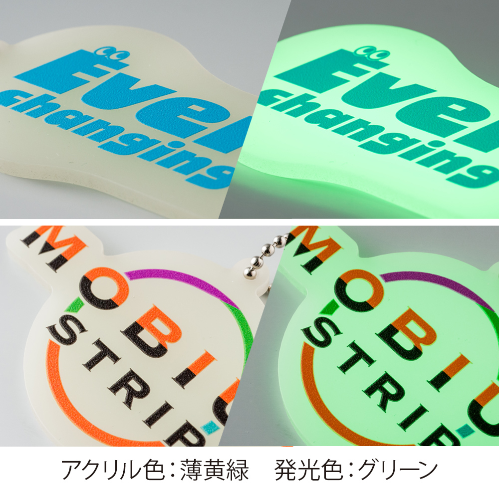 暗闇で鮮やかに光る“グリーン”蓄光仕様!自由な形もOKなオリジナルアクリルキーホルダーで、販促も記念品もインパクト大に(短納期対応商品)