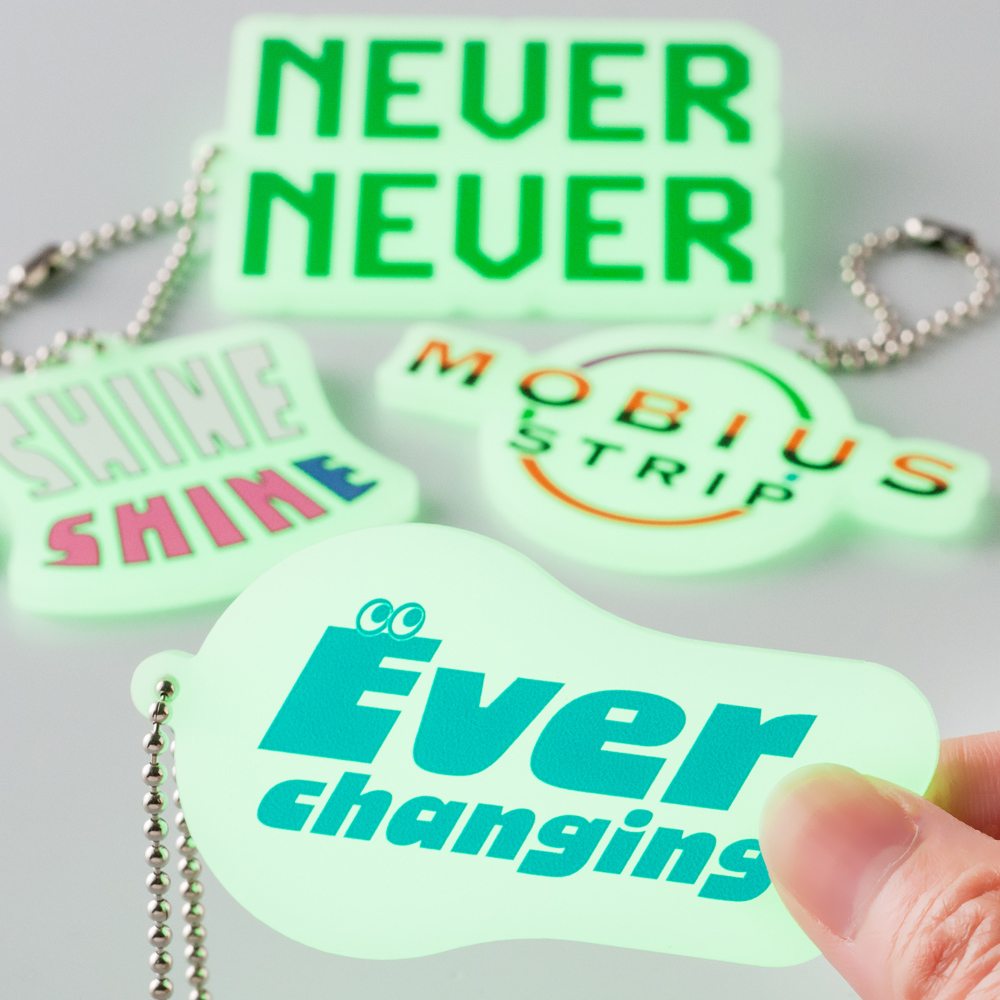 暗闇で鮮やかに光る“グリーン”蓄光仕様!自由な形もOKなオリジナルアクリルキーホルダーで、販促も記念品もインパクト大に(短納期対応商品)