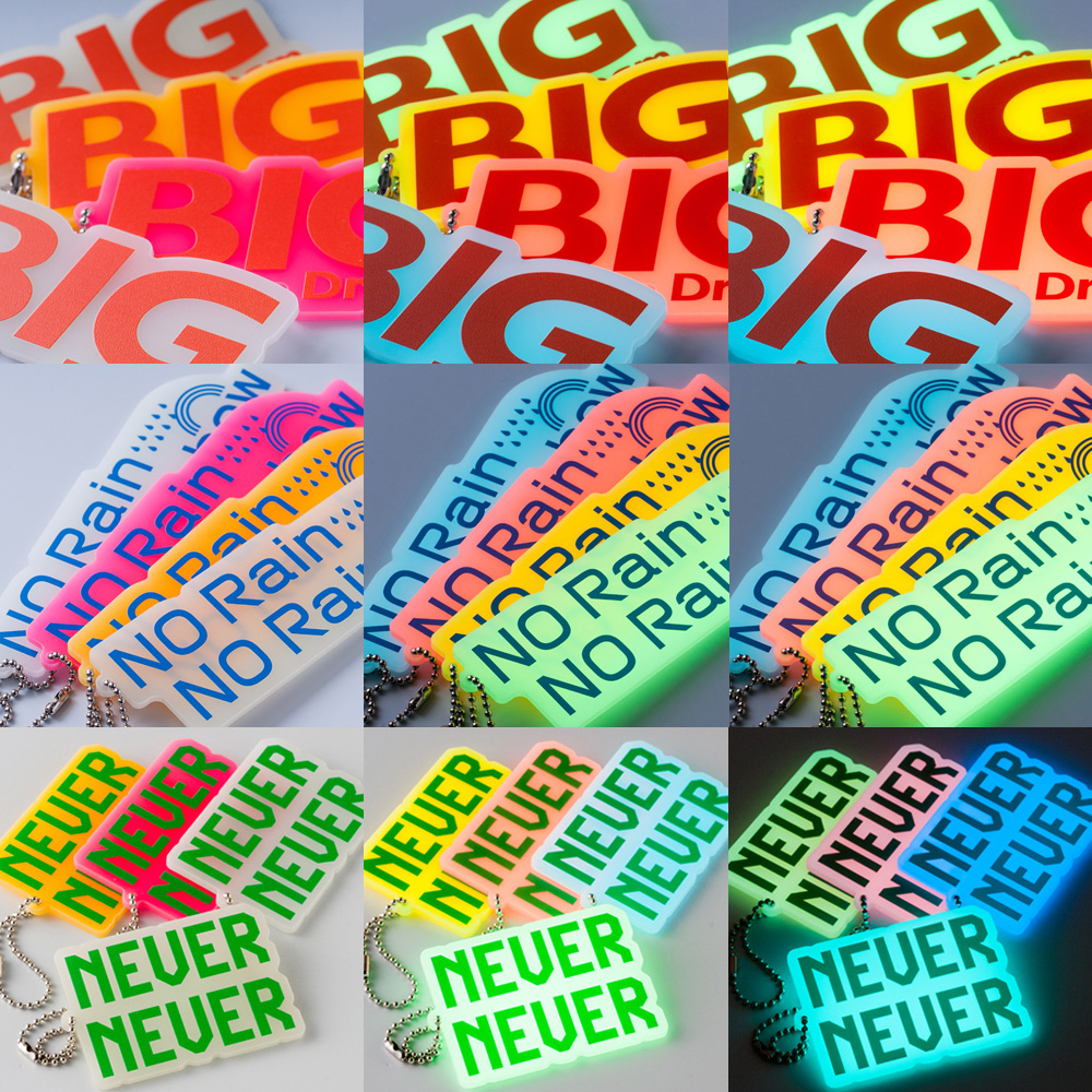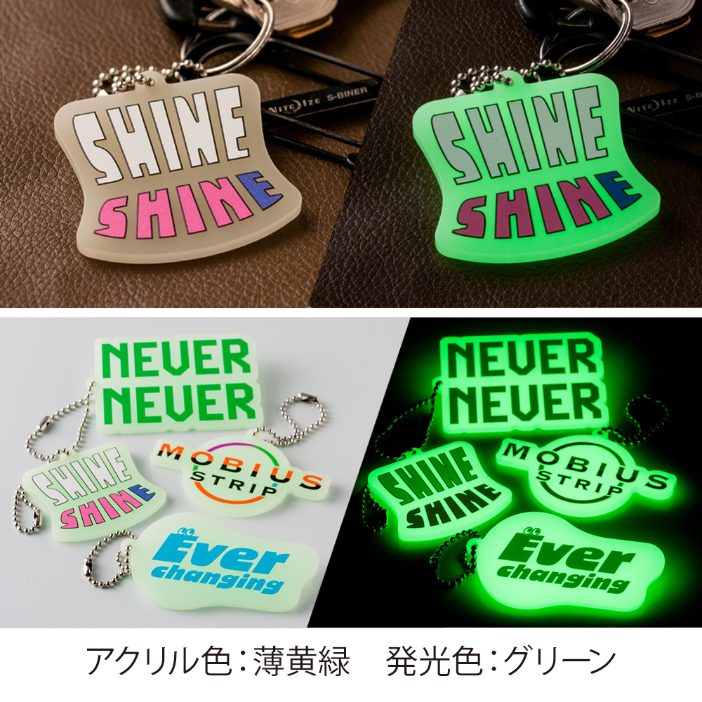 暗闇で鮮やかに光る“グリーン”蓄光仕様!自由な形もOKなオリジナルアクリルキーホルダーで、販促も記念品もインパクト大に(短納期対応商品)