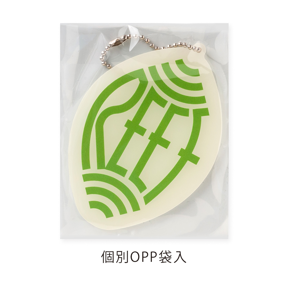 薄黄緑の蓄光アクリル素材(厚さ3mm)が暗闇でグリーンに発光するキーホルダー。オリジナル輪郭カット対応で、キャラクターやロゴなど自在にデザイン可能。表面は片面フルカラー+白押さえのUVインクジェット印刷。個別OPP袋包装、ボールチェーン付きで扱いやすさも◎。小ロット・短納期対応で販促やイベントにも適した一品です。