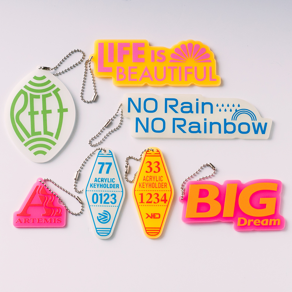 淡く発光する蓄光アクリルを使用したキーホルダー。片面フルカラー+白押さえ印刷により、様々なデザインを暗所でも浮かび上がらせます。オリジナル輪郭カットで自由な形状が可能、ボールチェーン付きで配布や販売にも最適。個別OPP袋包装も標準仕様で、イベントや販促企画にぴったりの一品です。
