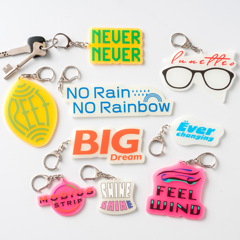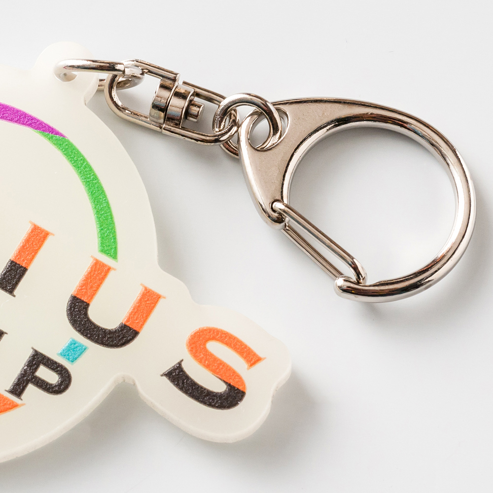 蓄光グリーン素材を使用したナスカン仕様のオリジナルアクリルキーホルダーです。暗所でやわらかく発光し、夜間イベントやライブ会場でも存在感を発揮します。自由形状カットと片面フルカラー印刷で、ロゴやキャラクターを鮮やかに表現可能です。バッグや鍵に取り付けやすく、販促品や物販アイテムとして高い実用性を備えています。
