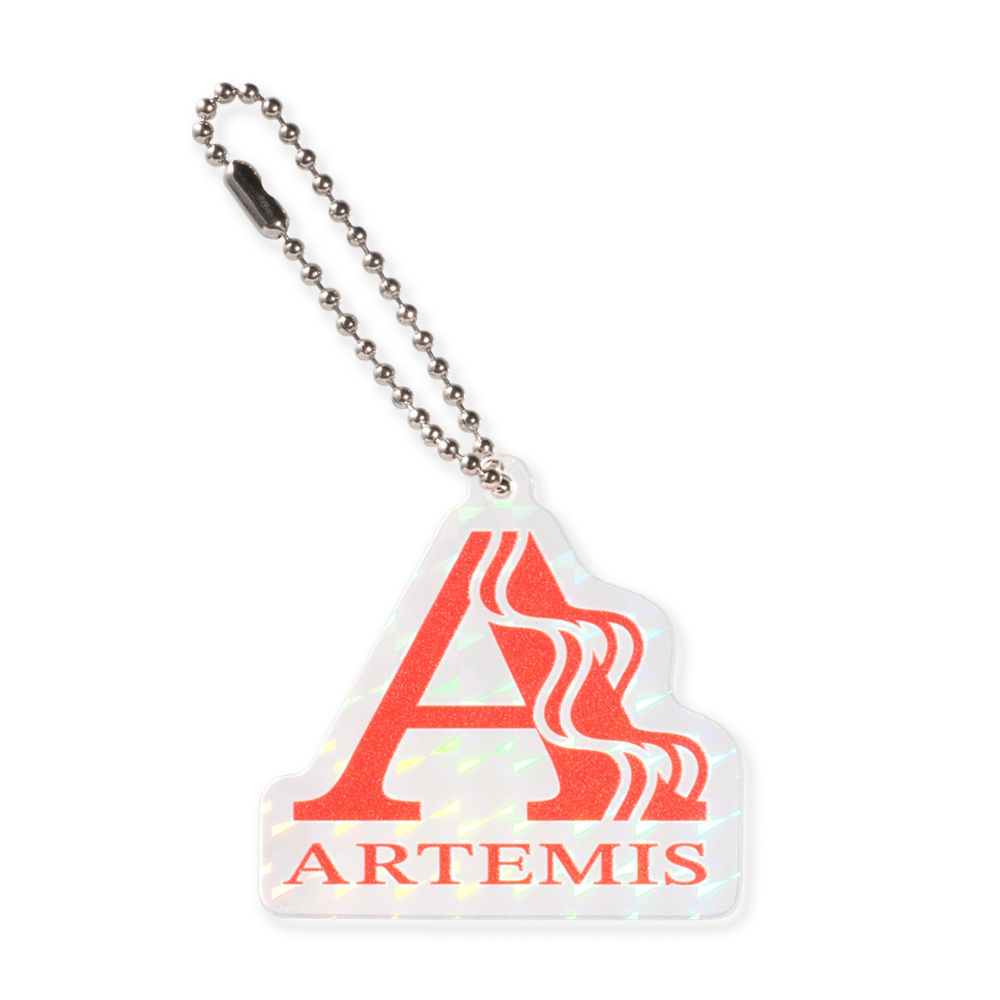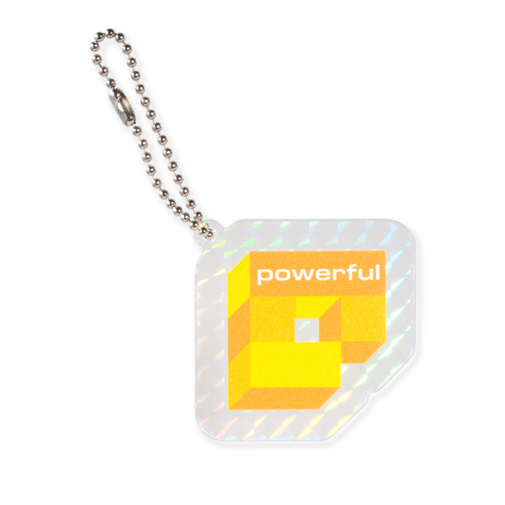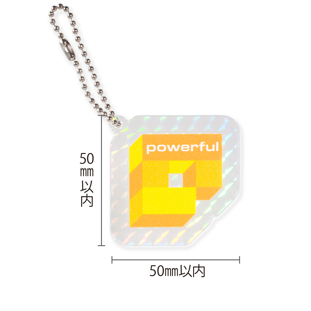 ホログラムアクリルのきらめき×ボールチェーン仕様。光を受けて虹色に変化するオリジナル形状アクリルキーホルダーで、ブランドを鮮烈に印象づける一品(短納期対応商品)