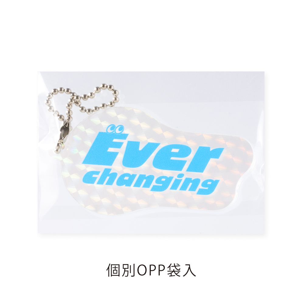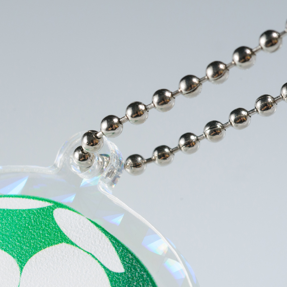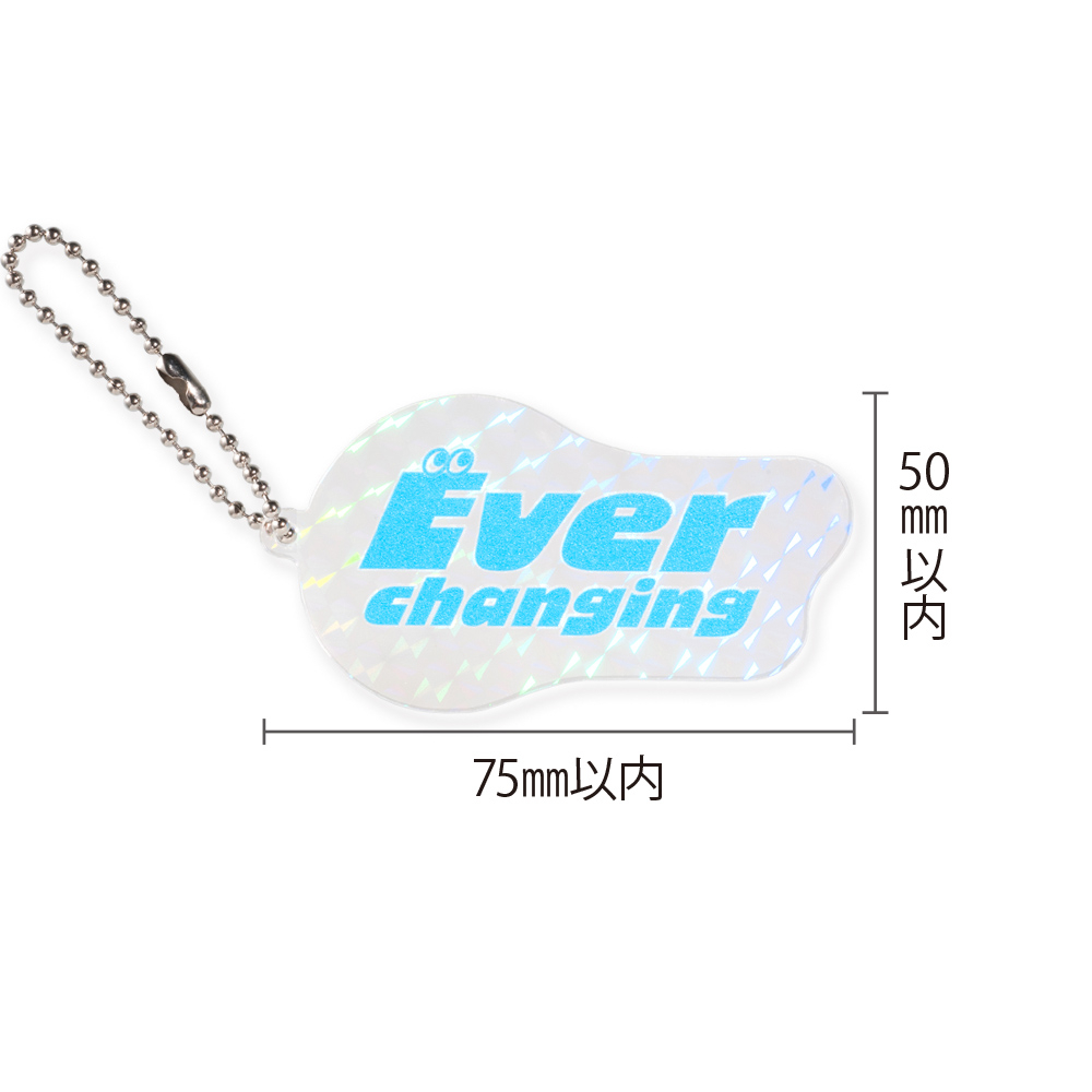 ホログラムアクリルのきらめき×ボールチェーン仕様。光を受けて虹色に変化するオリジナル形状アクリルキーホルダーで、ブランドを鮮烈に印象づける一品(短納期対応商品)