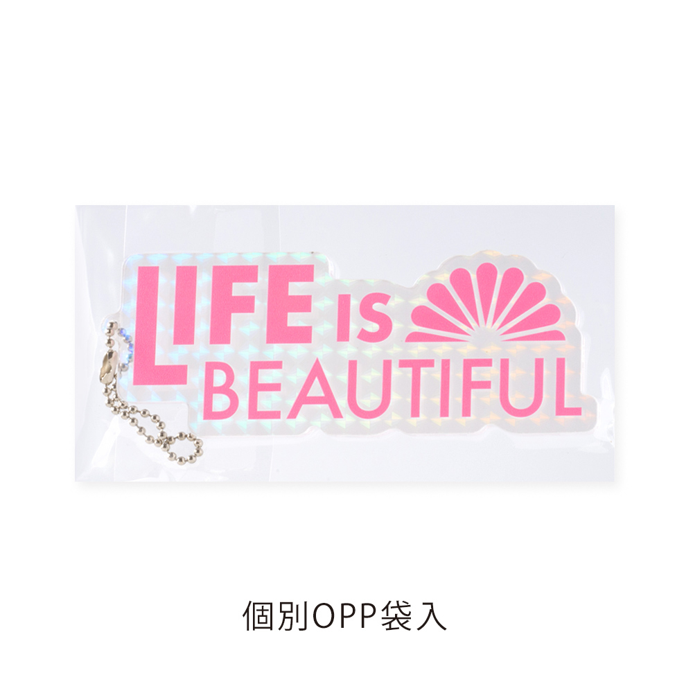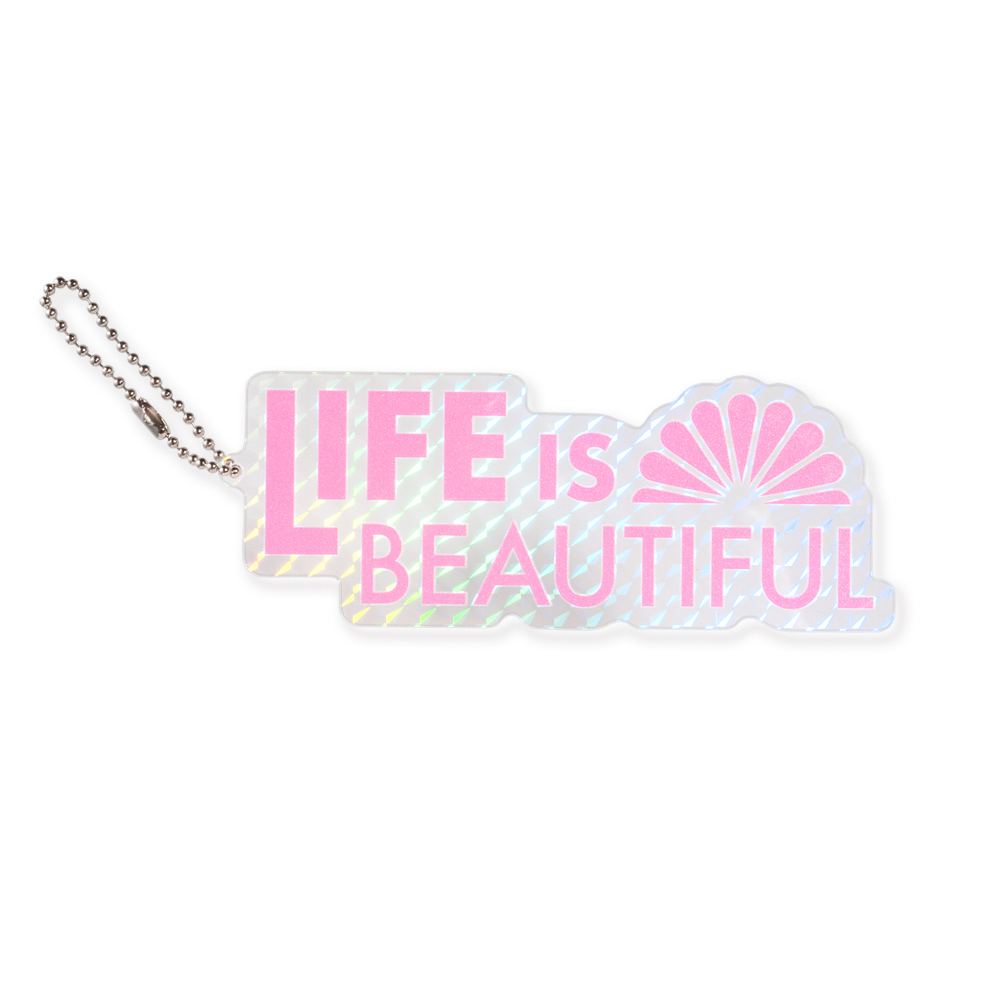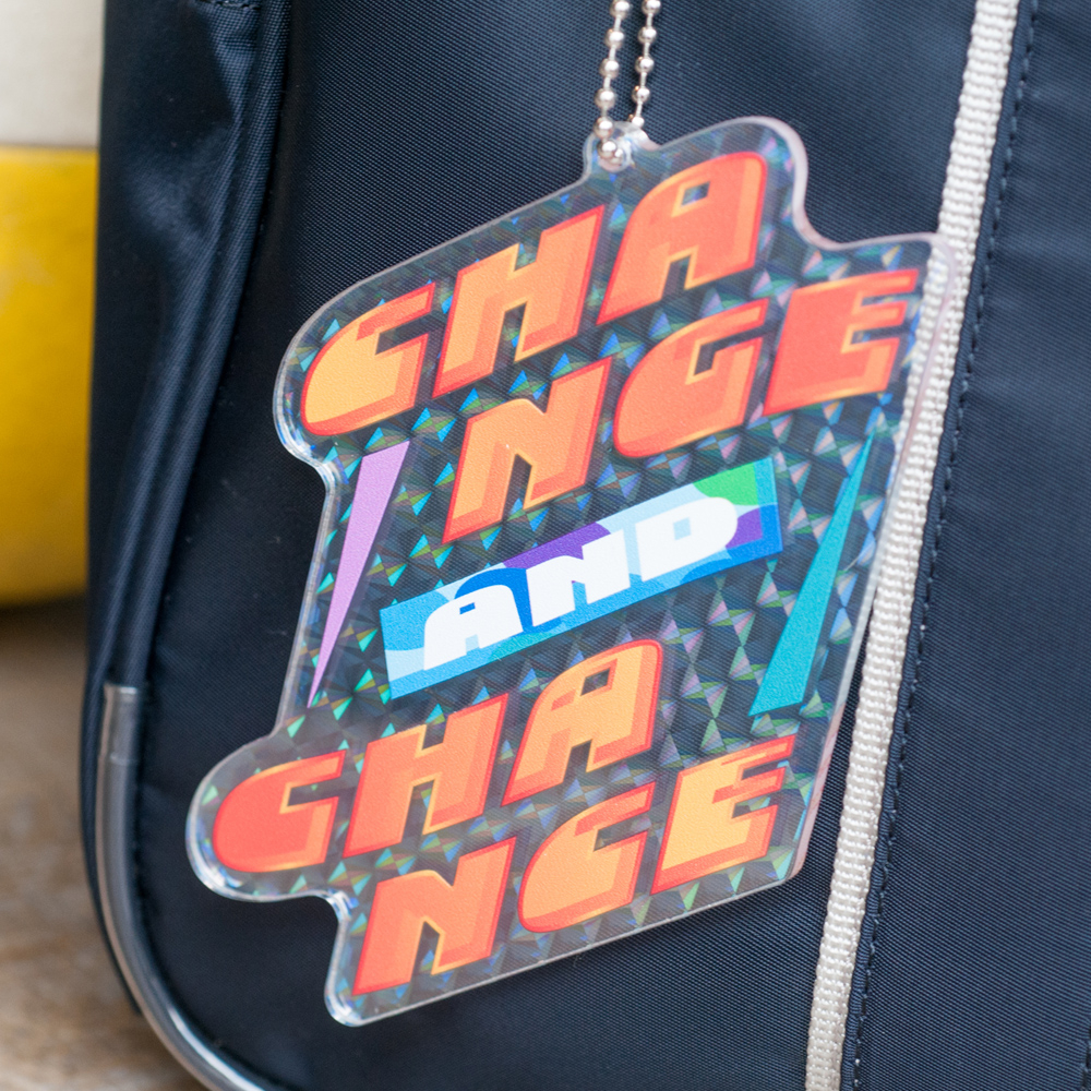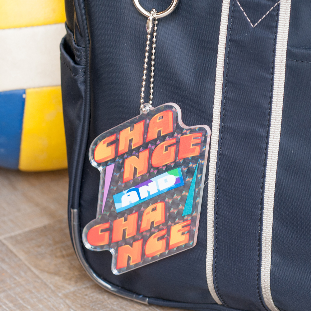 ホログラムアクリルのきらめき×ボールチェーン仕様。光を受けて虹色に変化するオリジナル形状アクリルキーホルダーで、ブランドを鮮烈に印象づける一品(短納期対応商品)