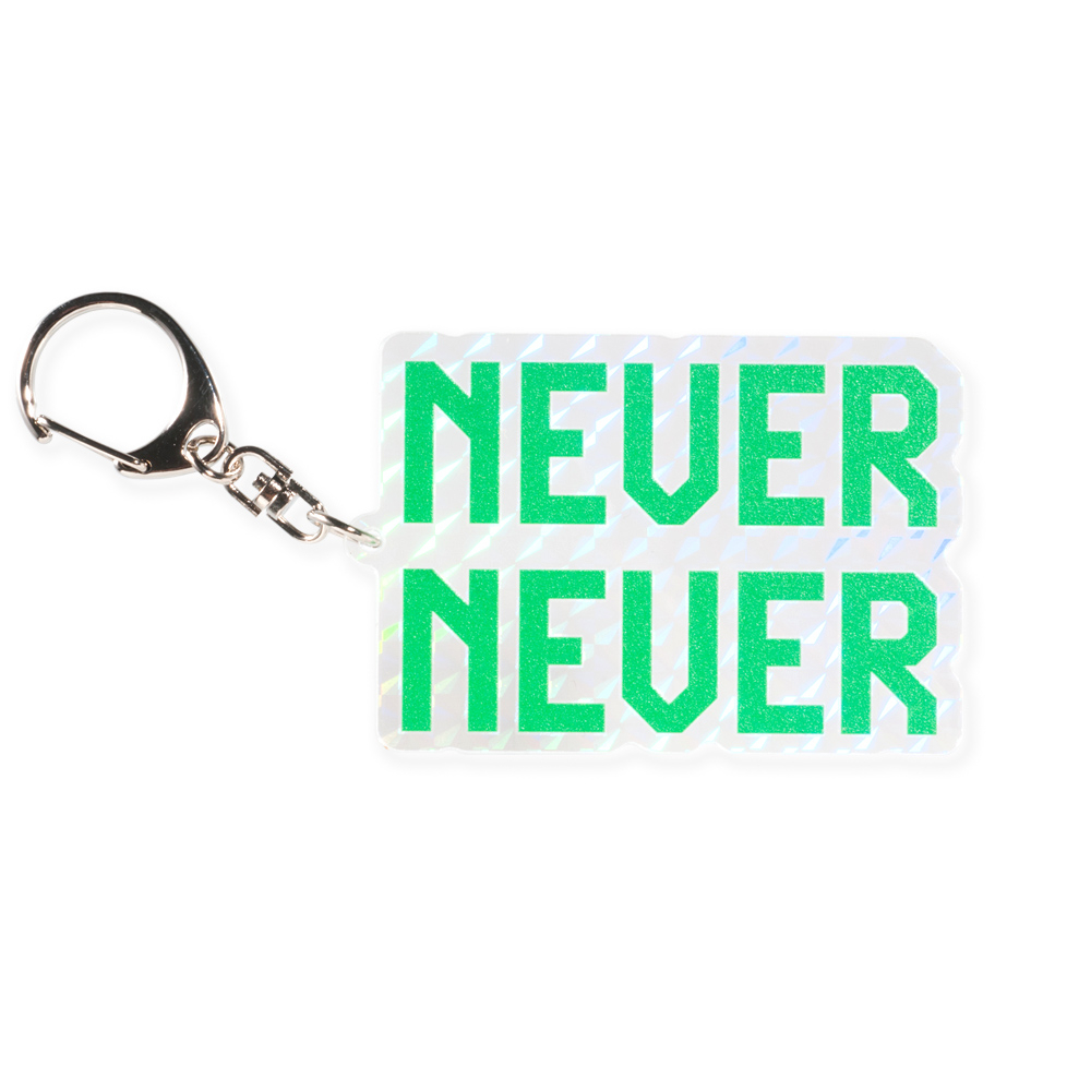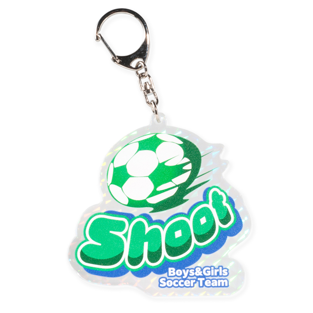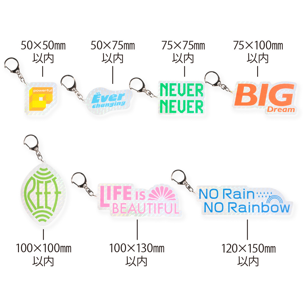 ナスカン仕様で取り付け自由自在。ホログラムアクリルが光を受けて虹色にきらめくオリジナル形状アクリルキーホルダー(短納期対応商品)