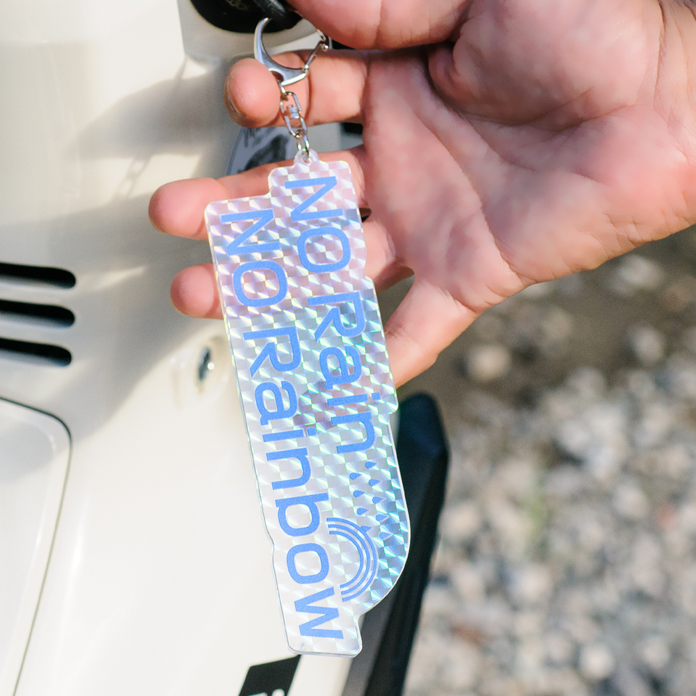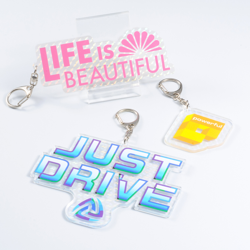ナスカン仕様で取り付け自由自在。ホログラムアクリルが光を受けて虹色にきらめくオリジナル形状アクリルキーホルダー(短納期対応商品)