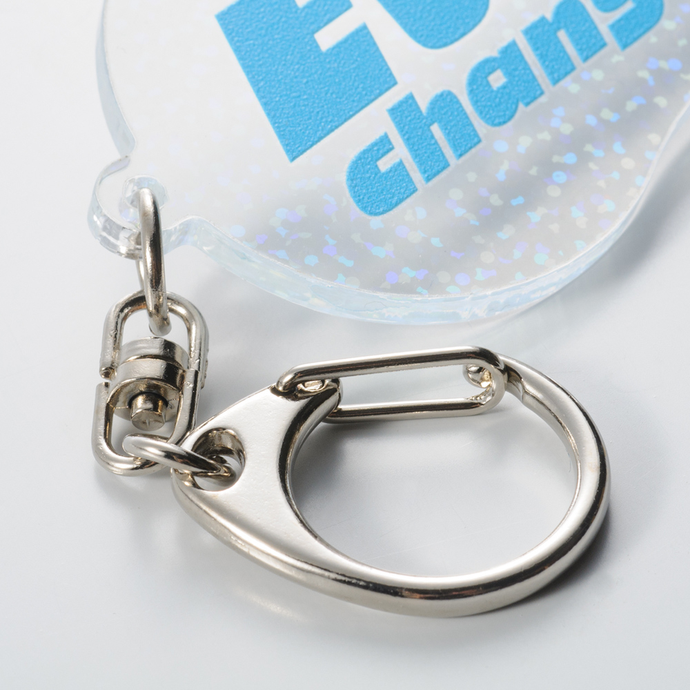 ホログラム/模様入りアクリル素材を採用し、光の変化で虹色に輝くナスカン仕様のオリジナルアクリルキーホルダーです。自由輪郭カットにより企業ロゴ・キャラクター・ブランドアイコンを自在に形状化でき、片面フルカラー印刷+白押さえで高発色を実現。バッグや鍵、リュックなどにナスカンで簡単に取り付けられ、イベント配布・物販・ノベルティ用途に最適な仕様となっています。