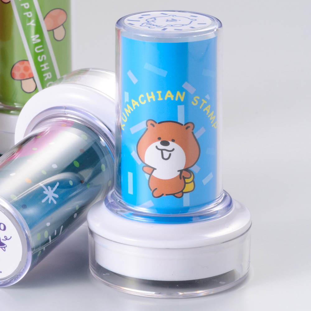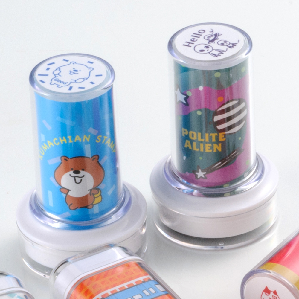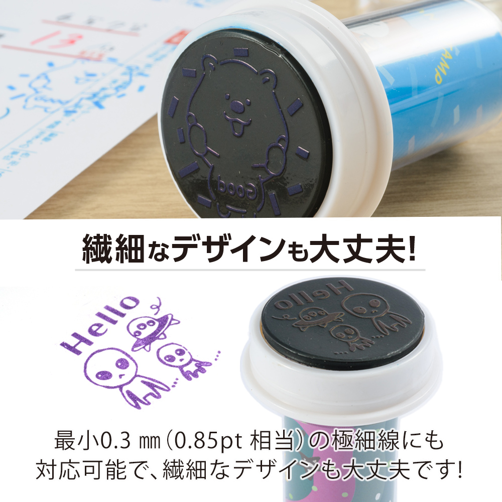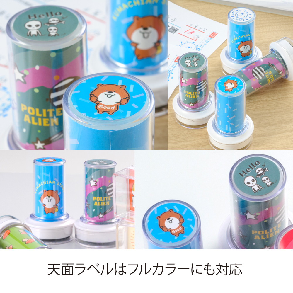 スタンプ台不要でポンポン捺印できる浸透印スタンプ。円柱クリア素材のかわいいスタンプ。天面シール、側面ラベルはフルカラー印刷可能で企業ノベルティ・イベント物販・ショップグッズに最適なオリジナル浸透印です。